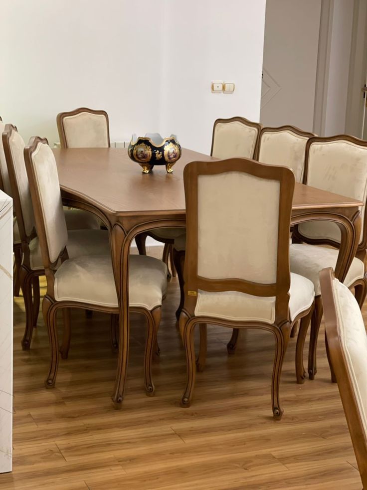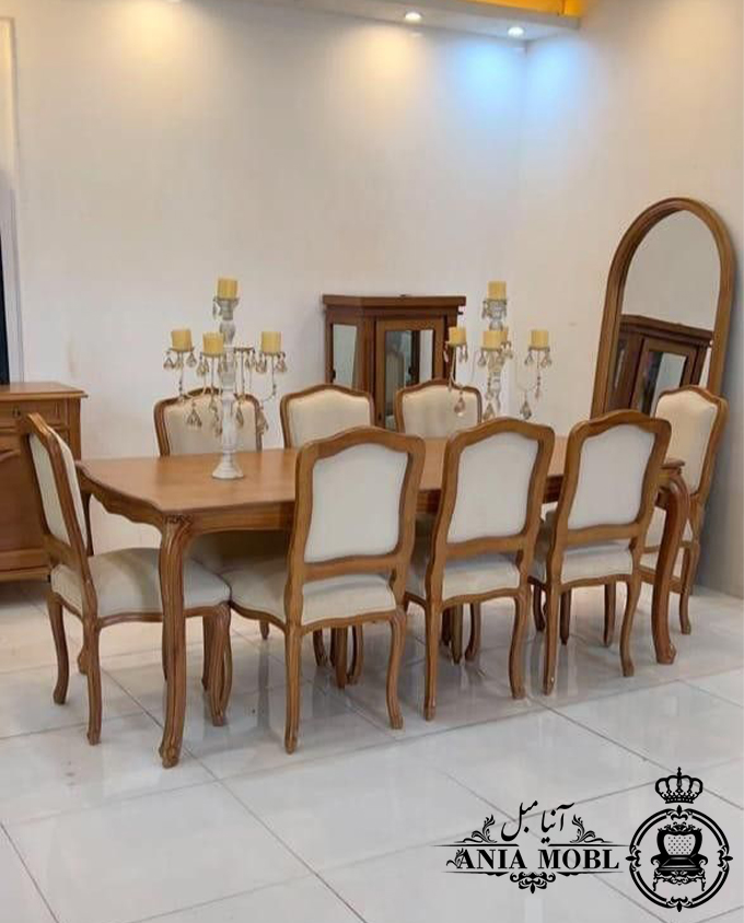 مجموعه میز و صندلی نهارخوری فرانسوی الهامگرفته از سبک کلاسیک فرانسوی است که با خطوط نرم، پایههای منقوش و جزئیات پتینه روحی از ظرافت و تاریخ را به فضای غذاخوری میآورد. بدنه از چوب مرغوب (مثلاً راش یا بلوط) ساخته شده و با پرداخت دستی و رنگ پتینه پوشش داده شده تا حس آنتیک و لوکس را خلق کند. صندلیها دارای پشتی ارگونومیک و فوم نشیمن با پارچه مبلی بافتدار یا مخملی هستند که همزمان راحتی و استحکام فراهم میکنند. این مجموعه مناسب فضاهای رسمی و صمیمی است و بهخوبی با دکوراسیونهای کلاسیک، نئوکلاسیک و حتی تلفیقی مدرن هماهنگ میشود.